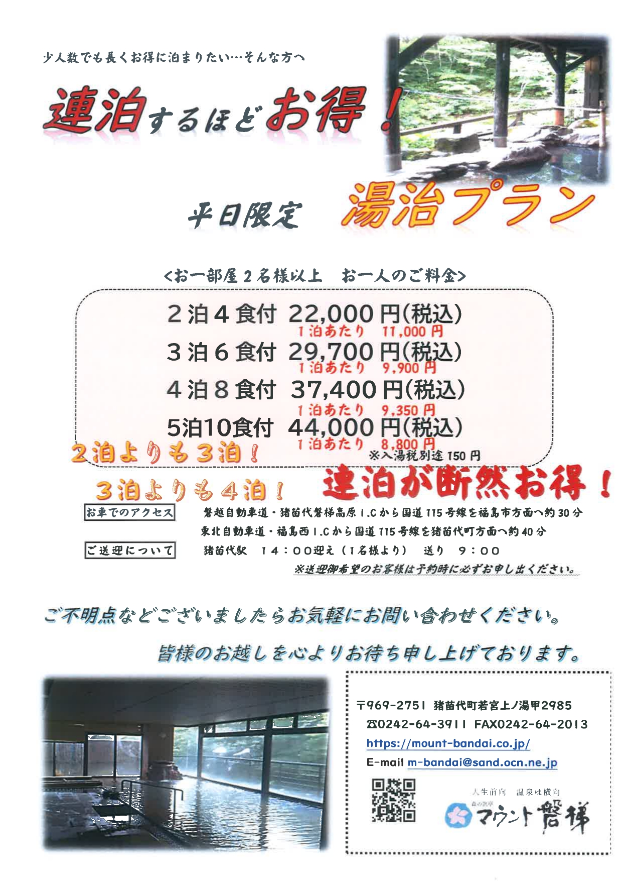 お知らせ 2026.04.19 連泊するほどお得!湯治プラン! Tweet Share +1 Hatena Pocket RSS feedly Pin it Tweet Share +1 Hatena Pocket RSS feedly Pin it お知らせ